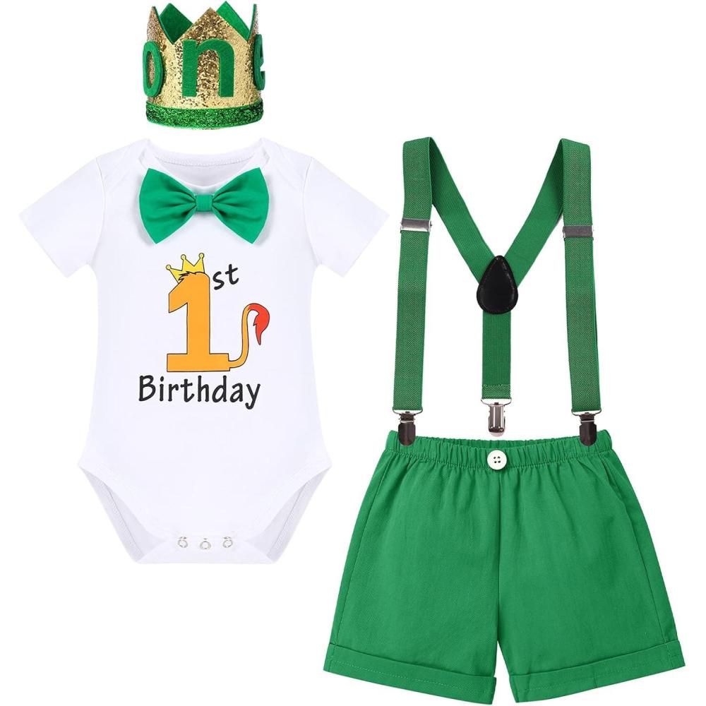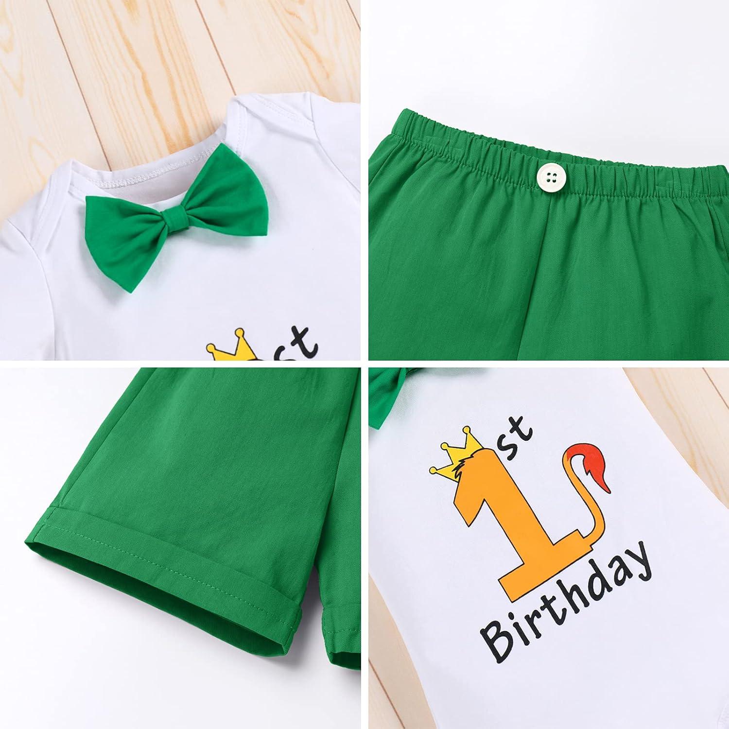 Baby Boys Lion Cake Smash Outfit Wild One Birthday Romper Suspenders Shorts Headband Jungle Animal Costume Photo Shoot(Green Dinosaur 1st Birthday)
