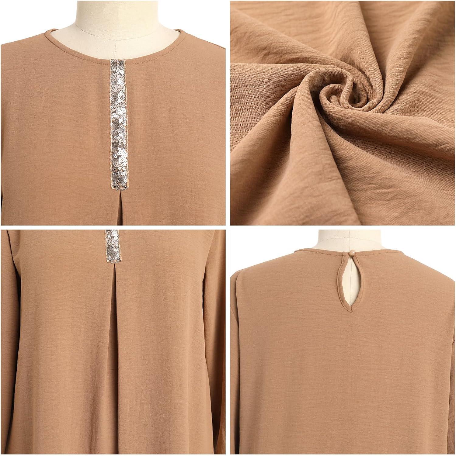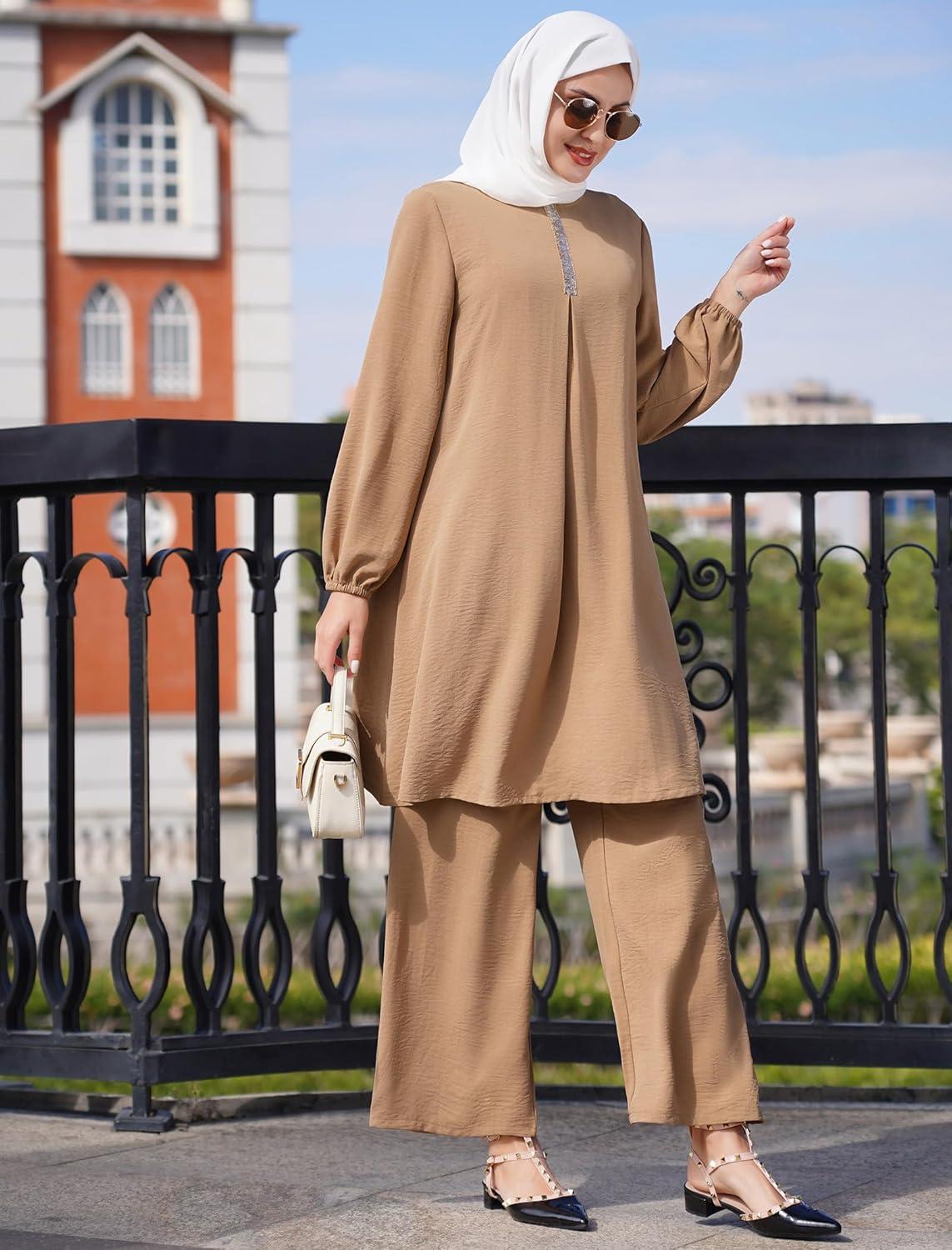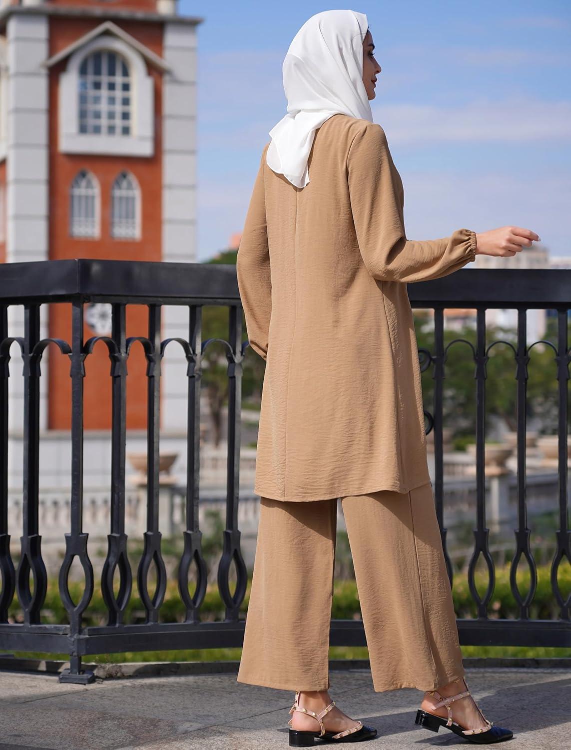 IDOPIP Abayas Dress for Women Muslim Outfits Long Sleeve Islamic Dress Shirt with Pants 2PCS Dubai Prayer Casual Clothes Sets(Khaki)