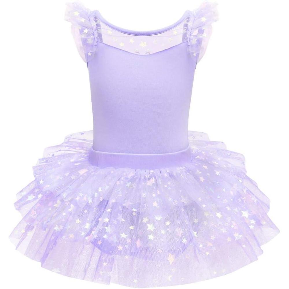 imageIDOPIP Girls Glitter Star Tutu Skirted Leotard Sequin Ruffle Sleeve Ballet Dance Dress Ballerina Dancewear Gymnastics CostumePurple