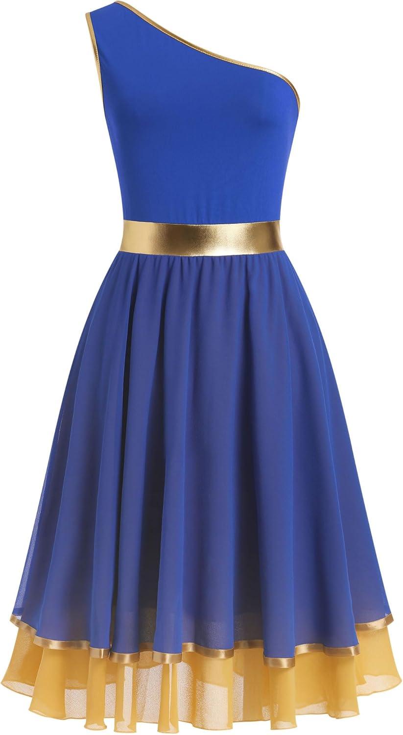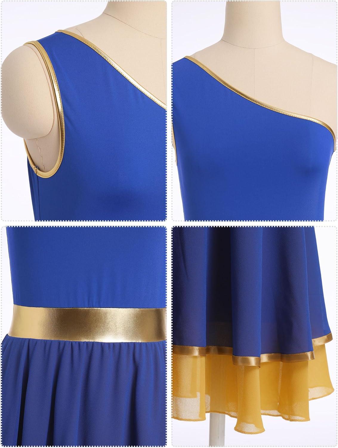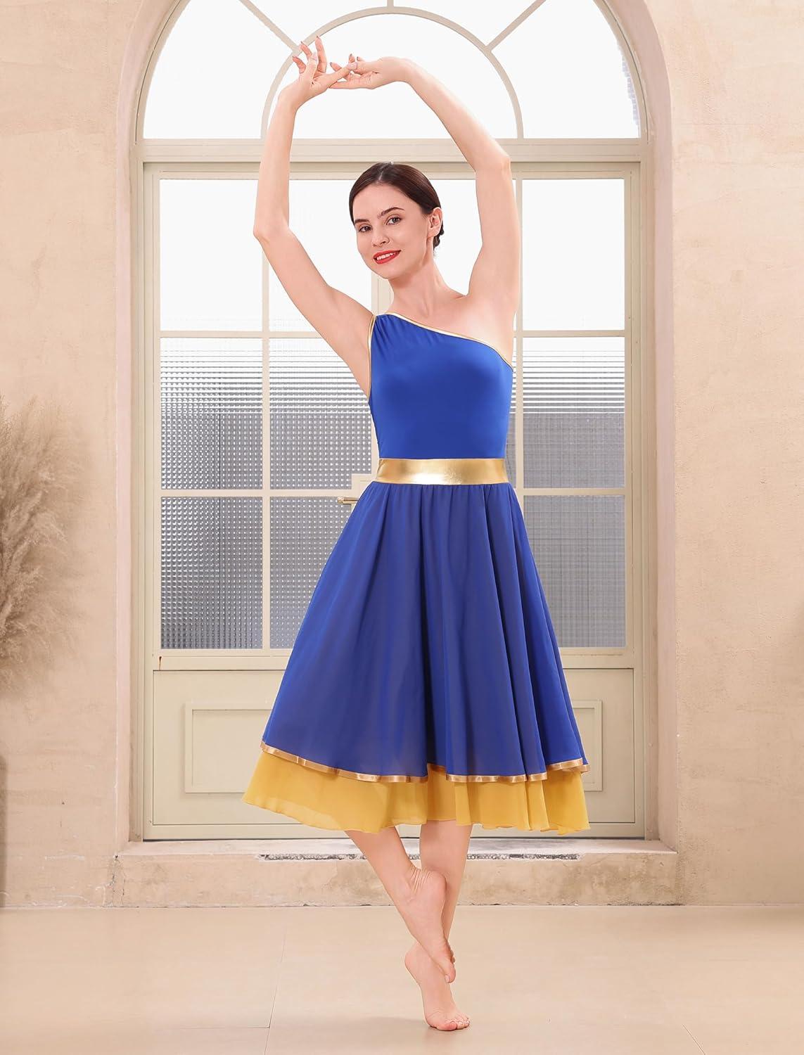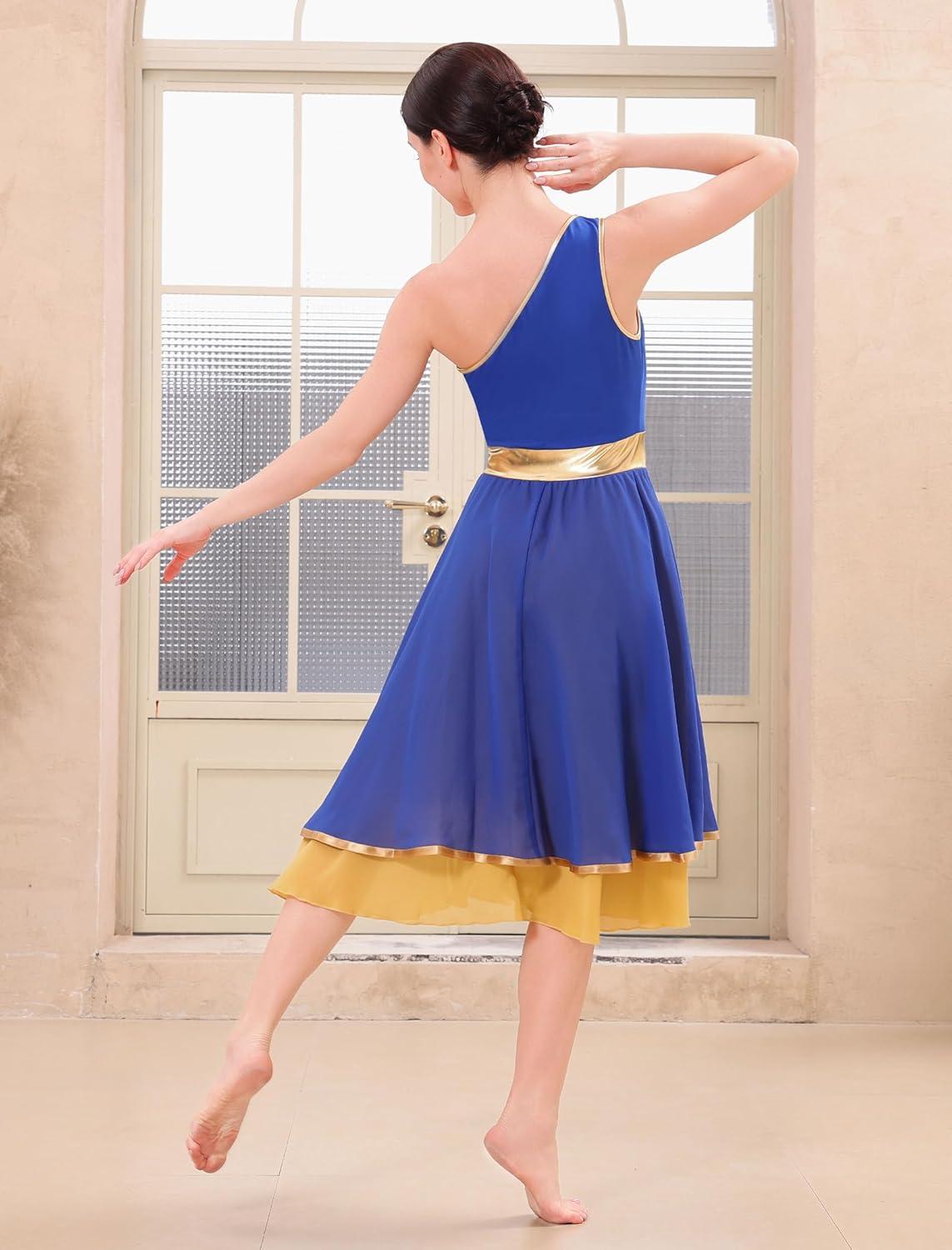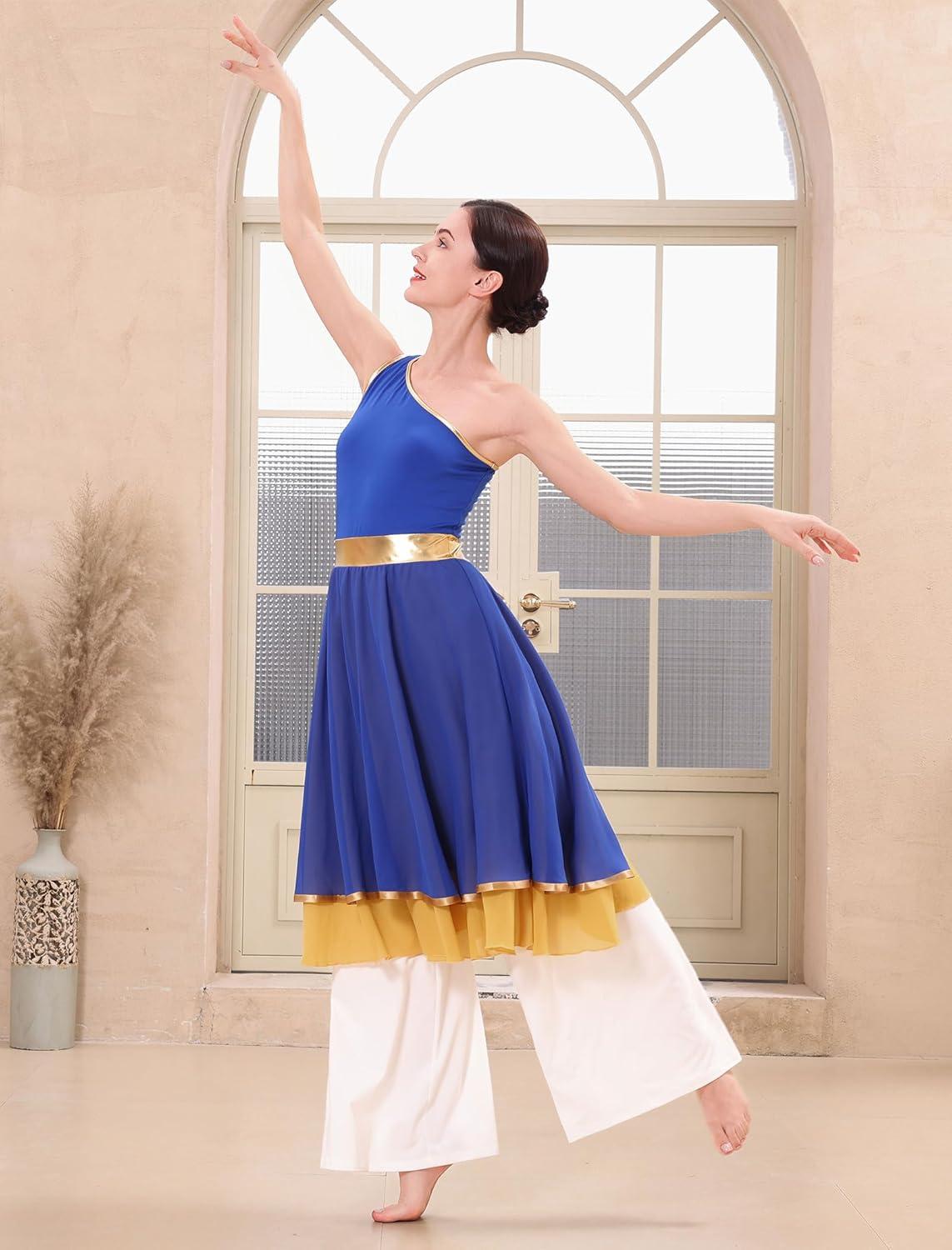 IDOPIP Metallic Color Block Praise Dance Overlay Dress for Women Asymmetrical One Shoulder Worship Tunic Liturgical Dancewear(Royal Blue)