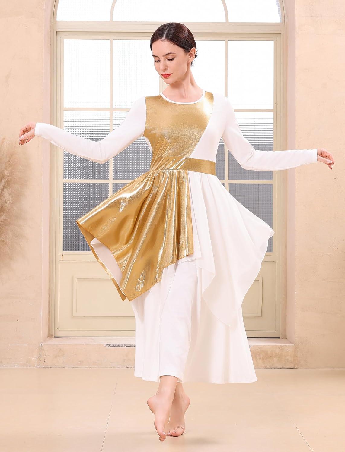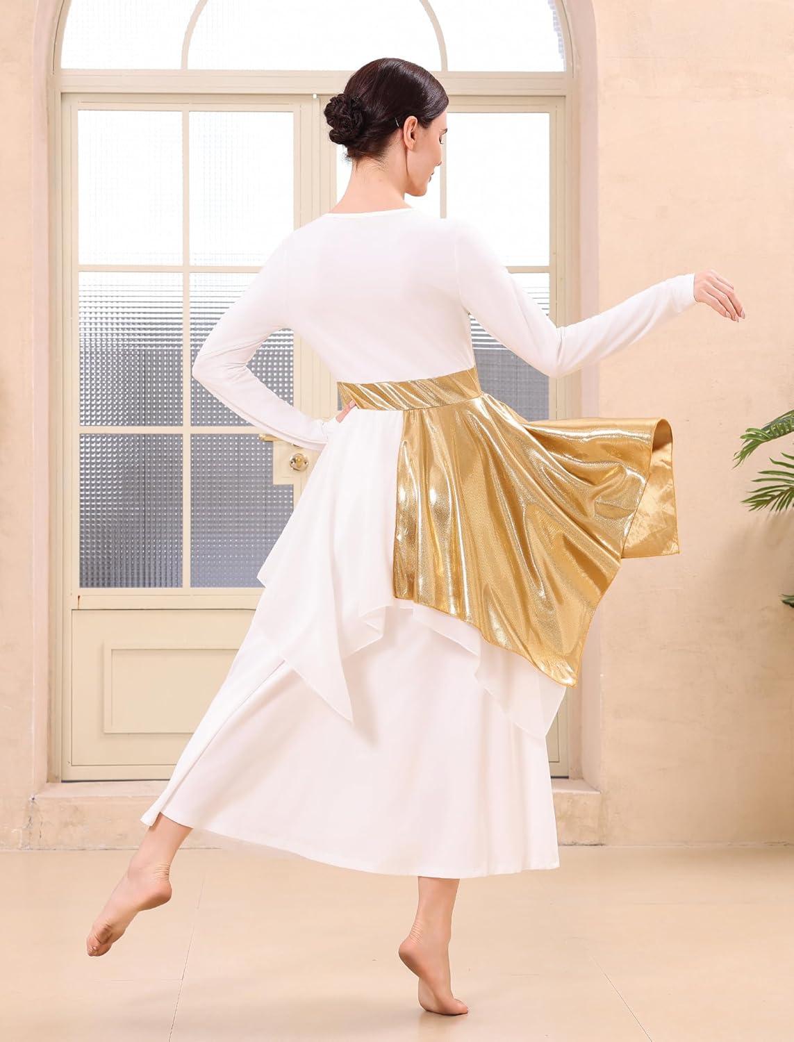IDOPIP Metallic Praise Dance Dress for Women Asymmetric Ruffle Overlay Dresses Liturgical Lyrical Dancewear Worship Costume(White)