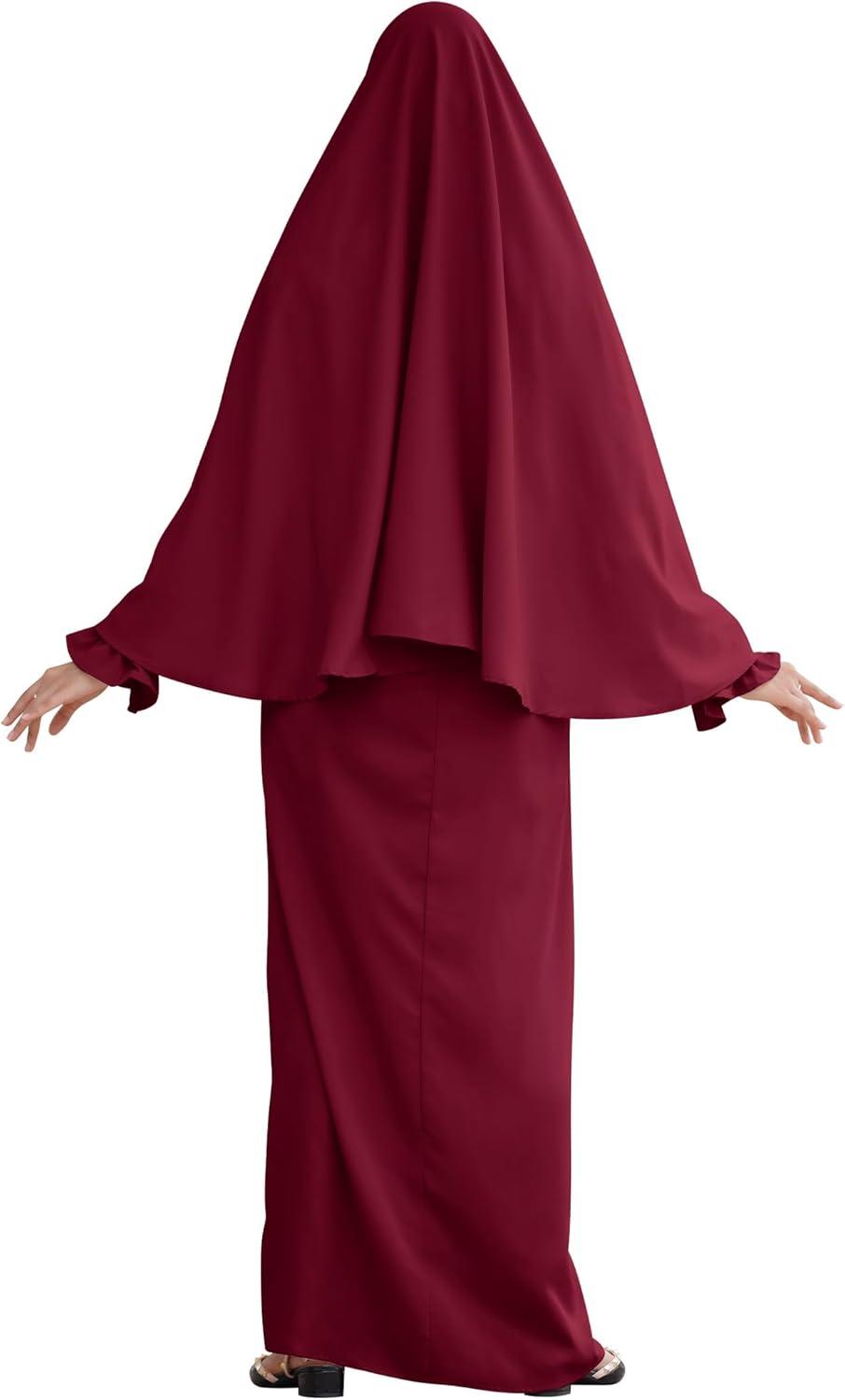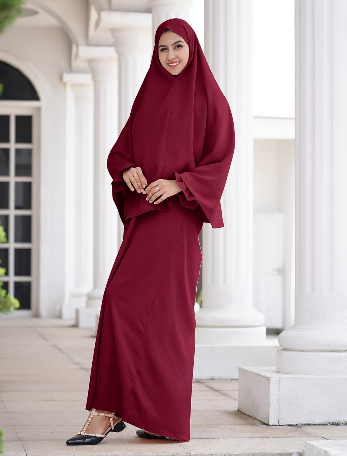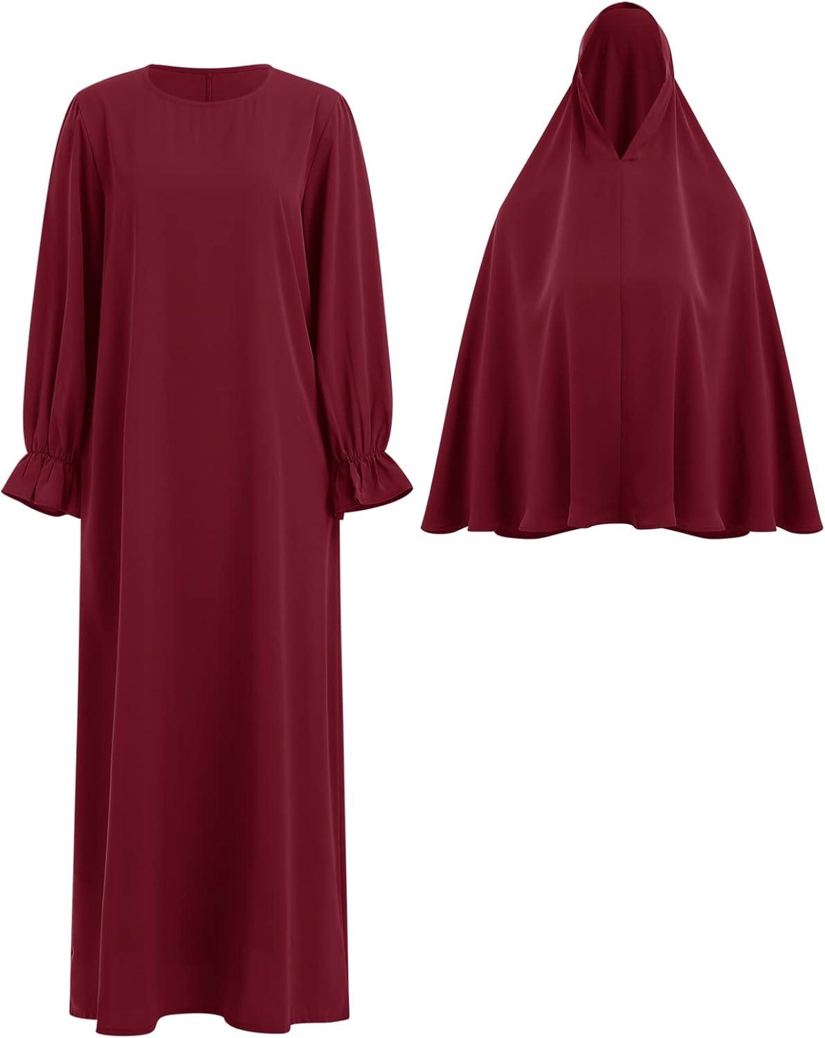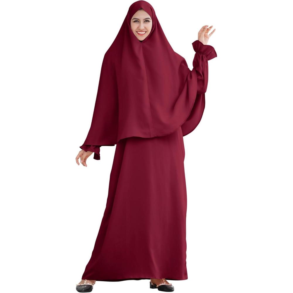 IDOPIP Muslim Abaya for Women One Piece Long Sleeve Islamic Prayer Dress Maxi Kaftan Robe Prayer Clothes with Khimar Hijab(Wine Red)