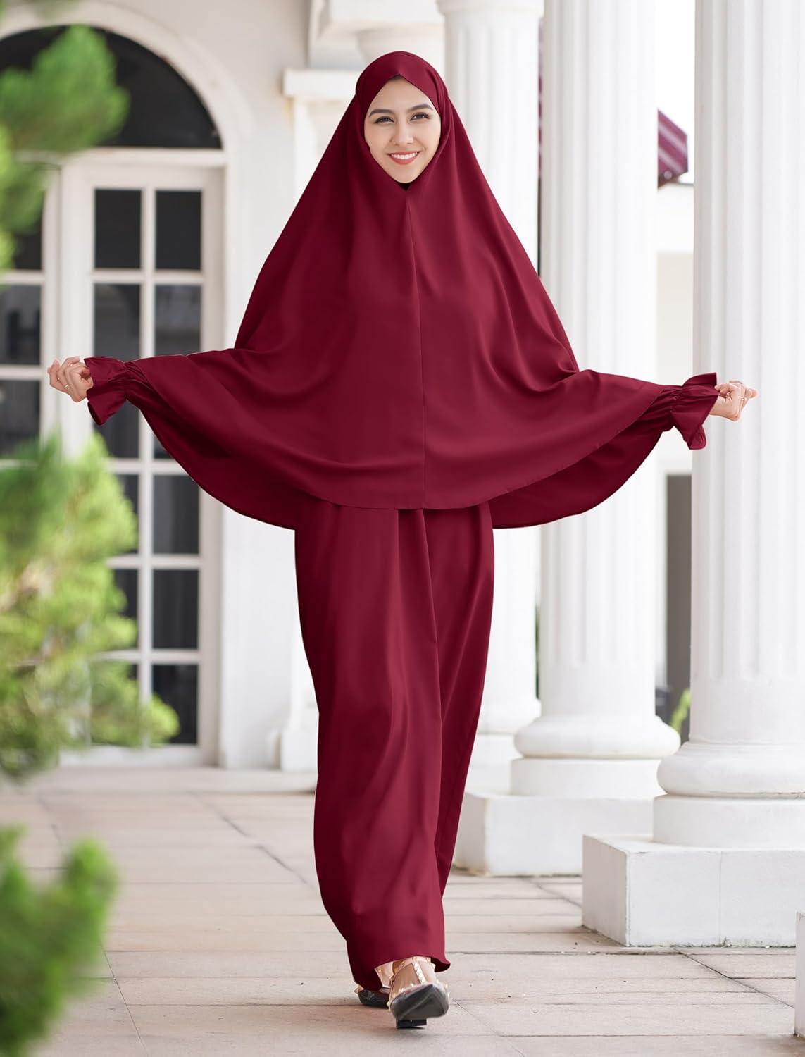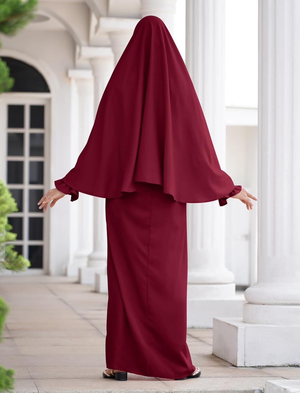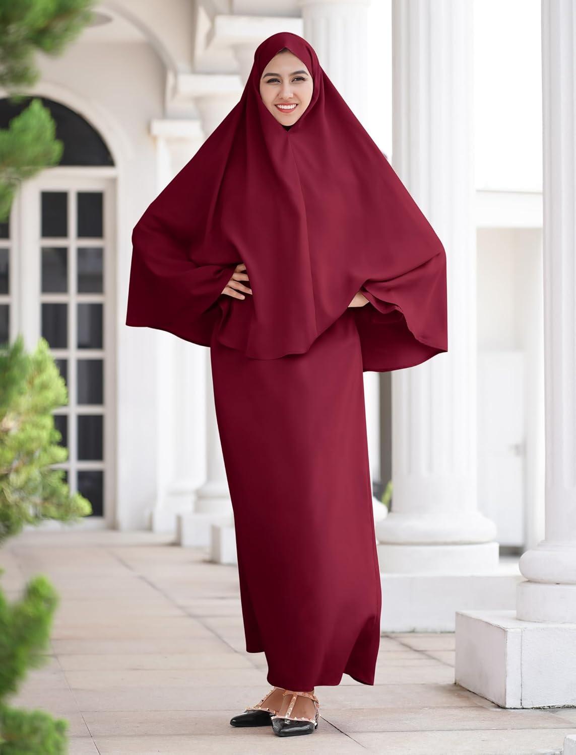 IDOPIP Muslim Abaya for Women One Piece Long Sleeve Islamic Prayer Dress Maxi Kaftan Robe Prayer Clothes with Khimar Hijab(Wine Red)
