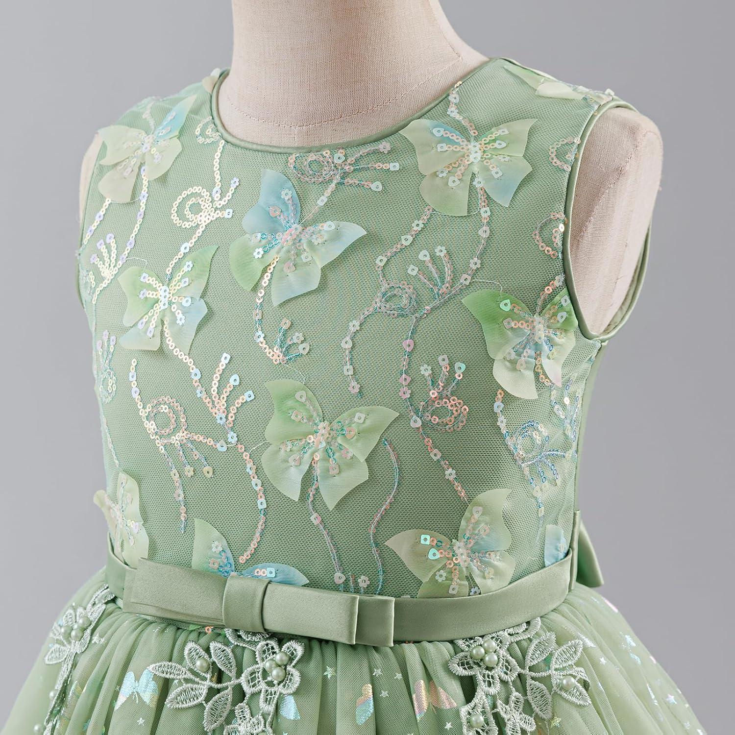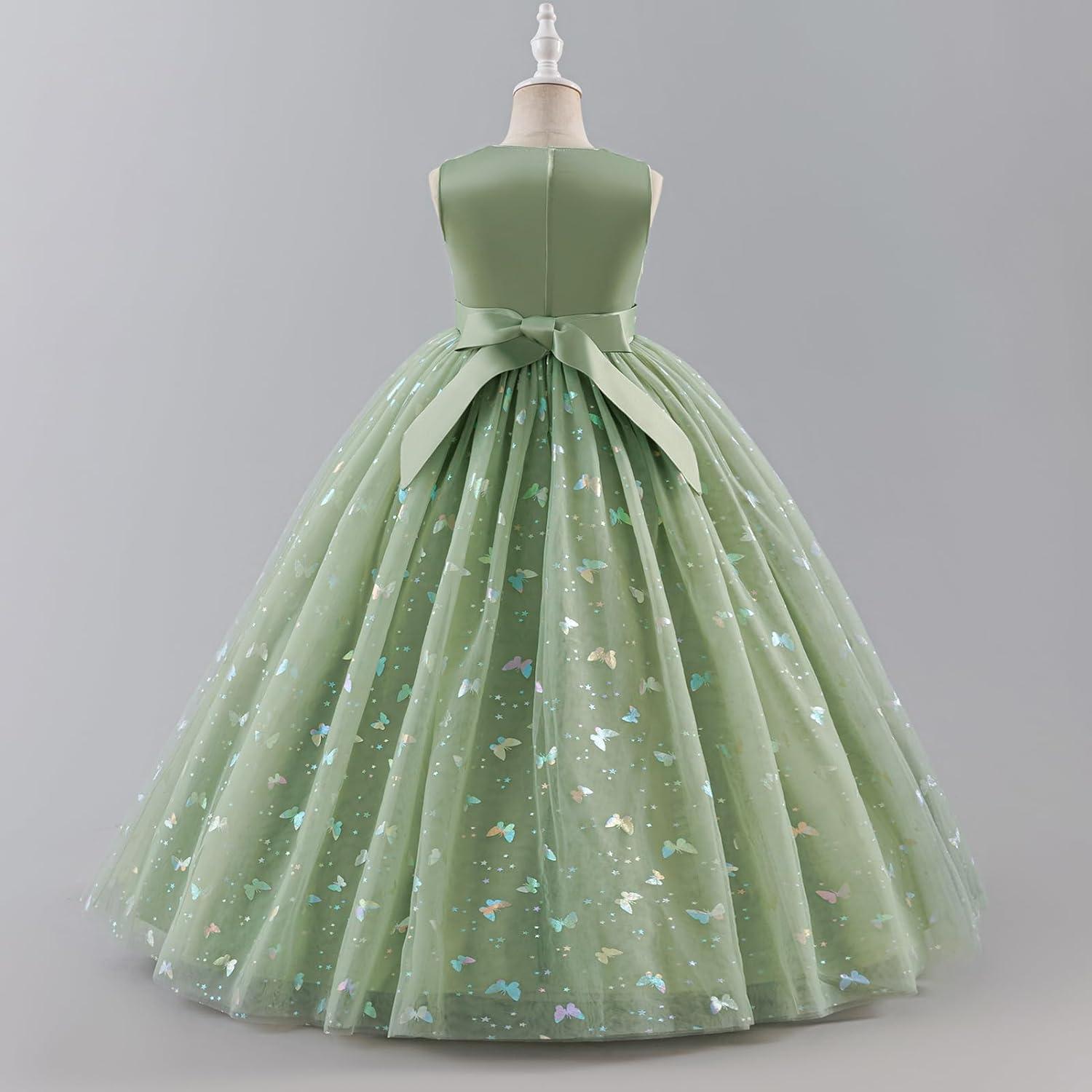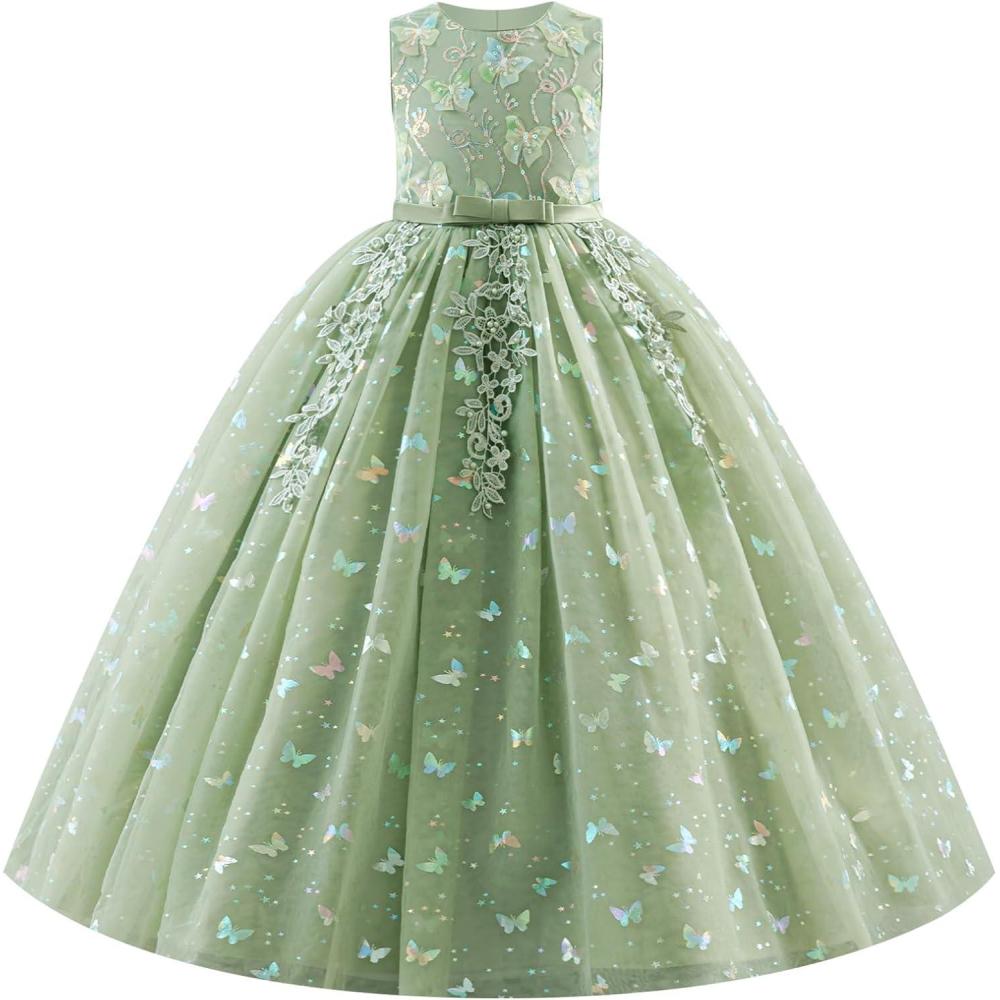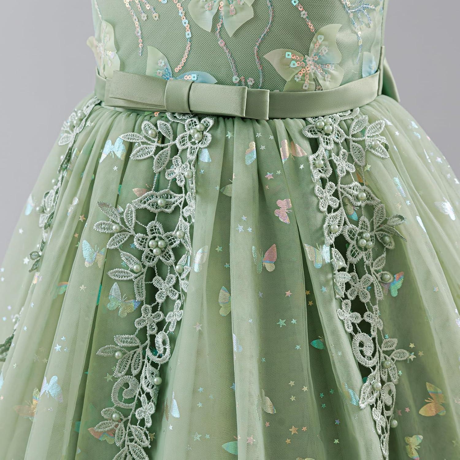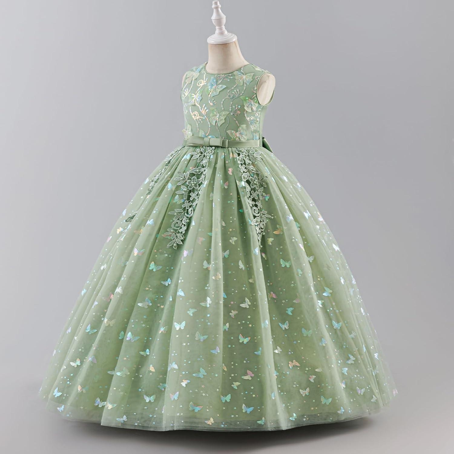 IDOPIP Sequin Flower Girl Lace Dress for Kids Wedding Pageant Party Formal Long Gown Princess First Communion Tulle Dresses(Green Sequin Butterfly)