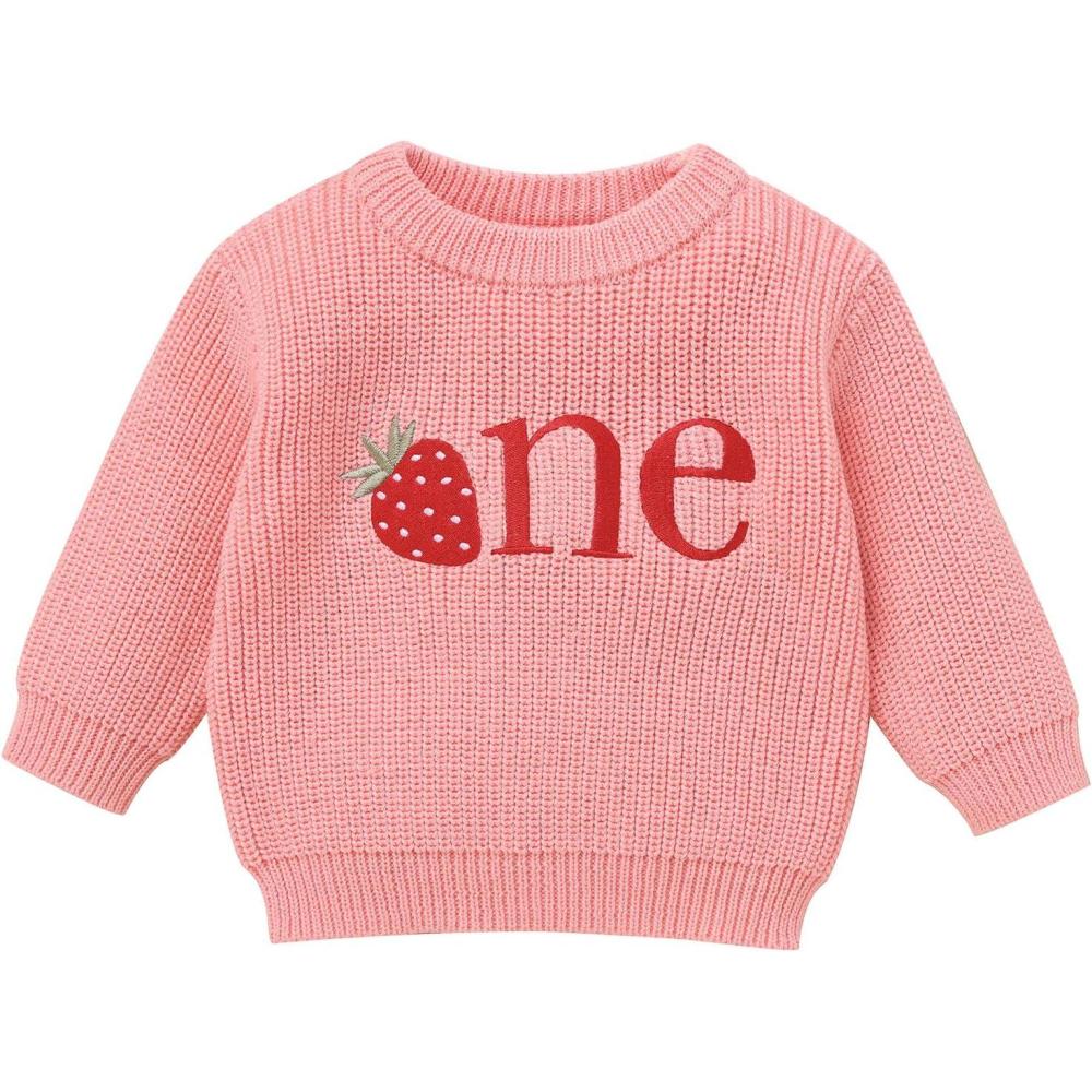 imageIDOPIP Toddler Baby Girls First Birthday Outfit Boho Embroidery One Sweater Top Knit Pullover Sweatshirt Fall Winter ClothesPink Strawberry