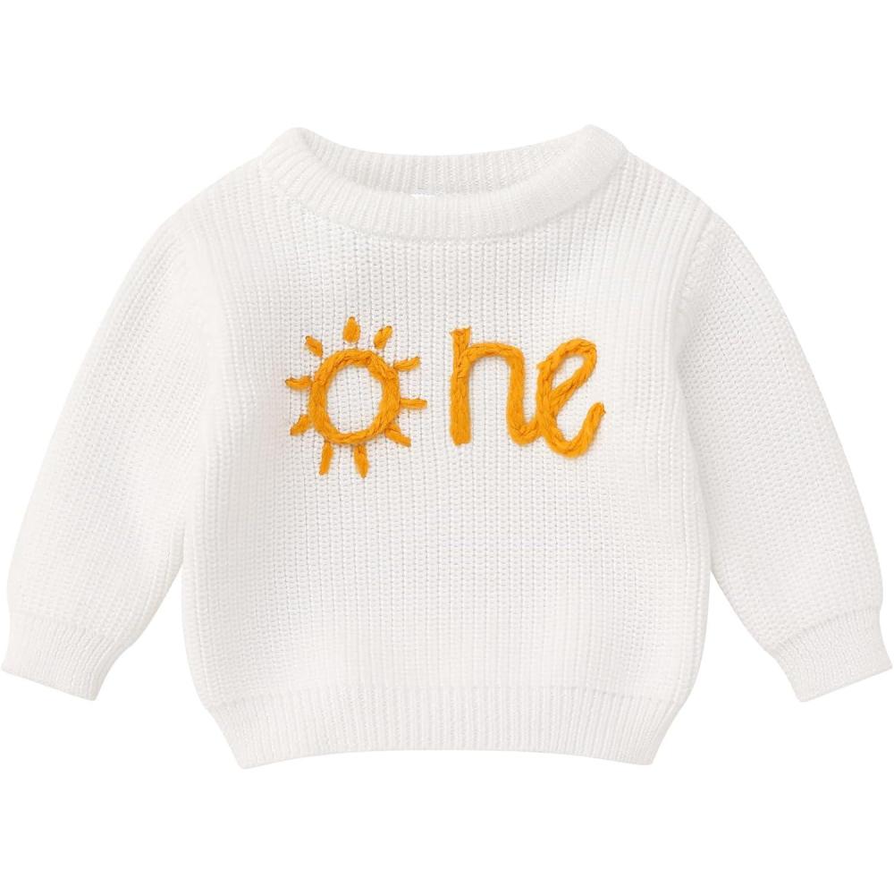 IDOPIP Toddler Baby Girls First Birthday Outfit Boho Embroidery One Sweater Top Knit Pullover Sweatshirt Fall Winter Clothes(White Sun One)