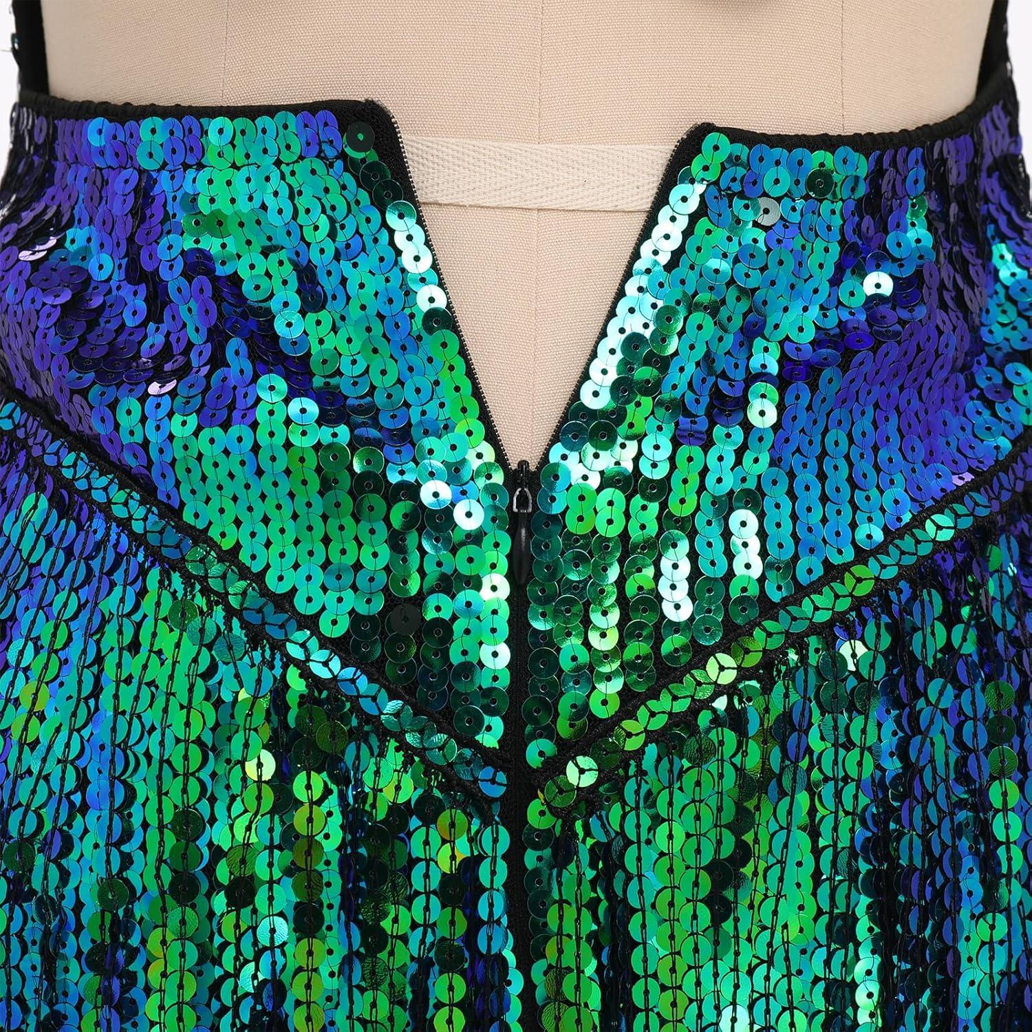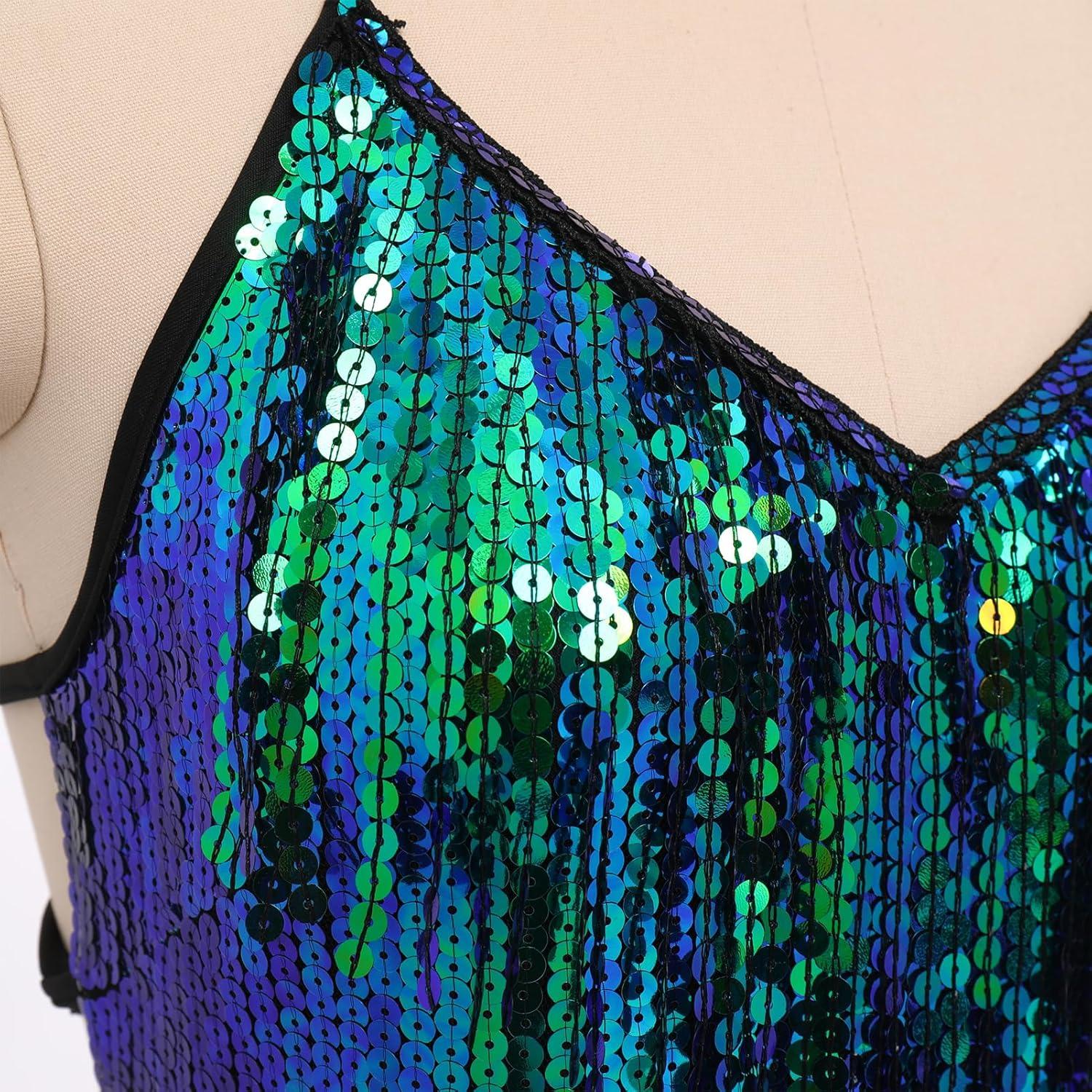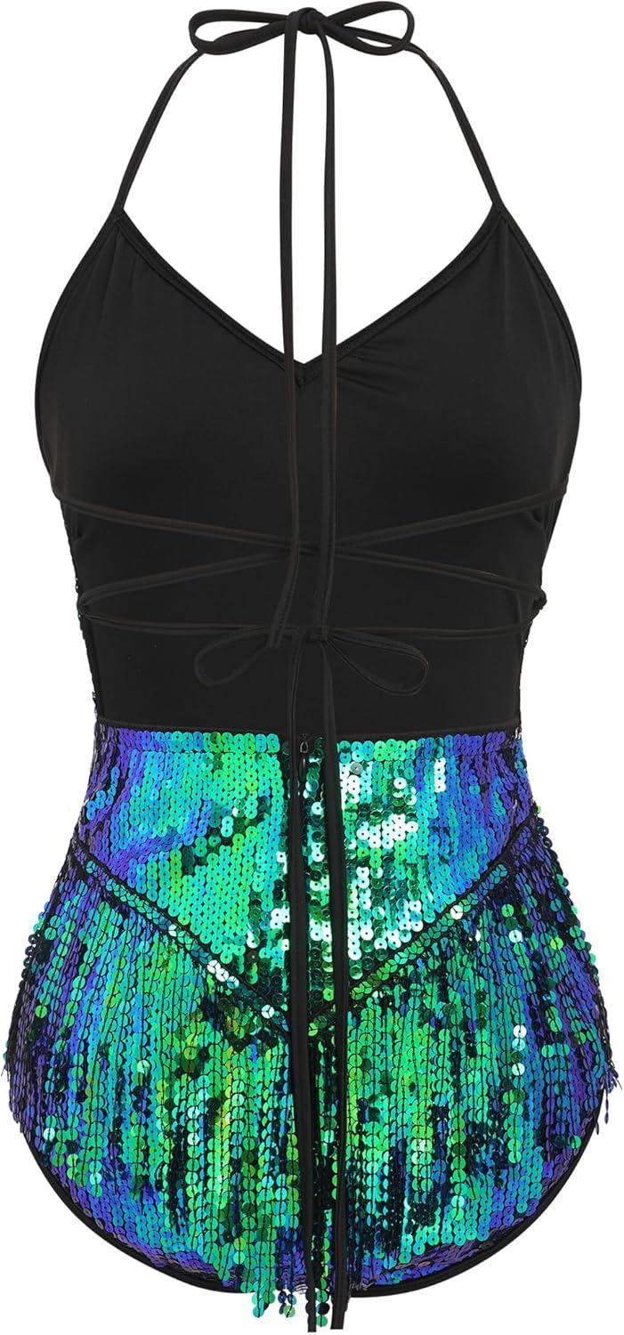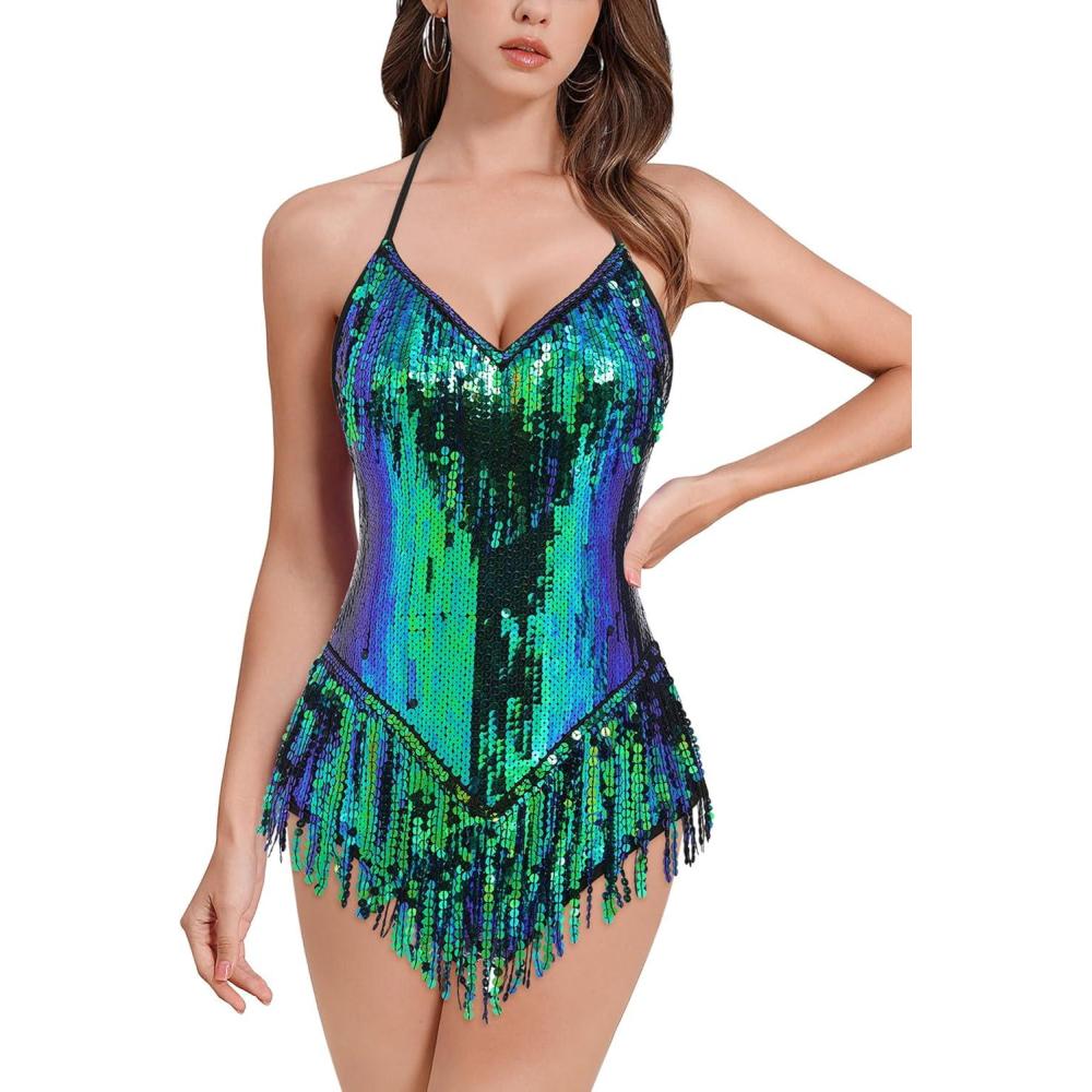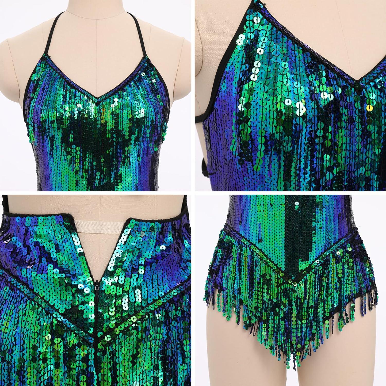 IDOPIP Women Sequin Fringe Bodysuit Sparkly Tassel Leotard Romper Women’s Latin Dance Dress Sexy Festival Rave Party Outfits(Green + Blue)