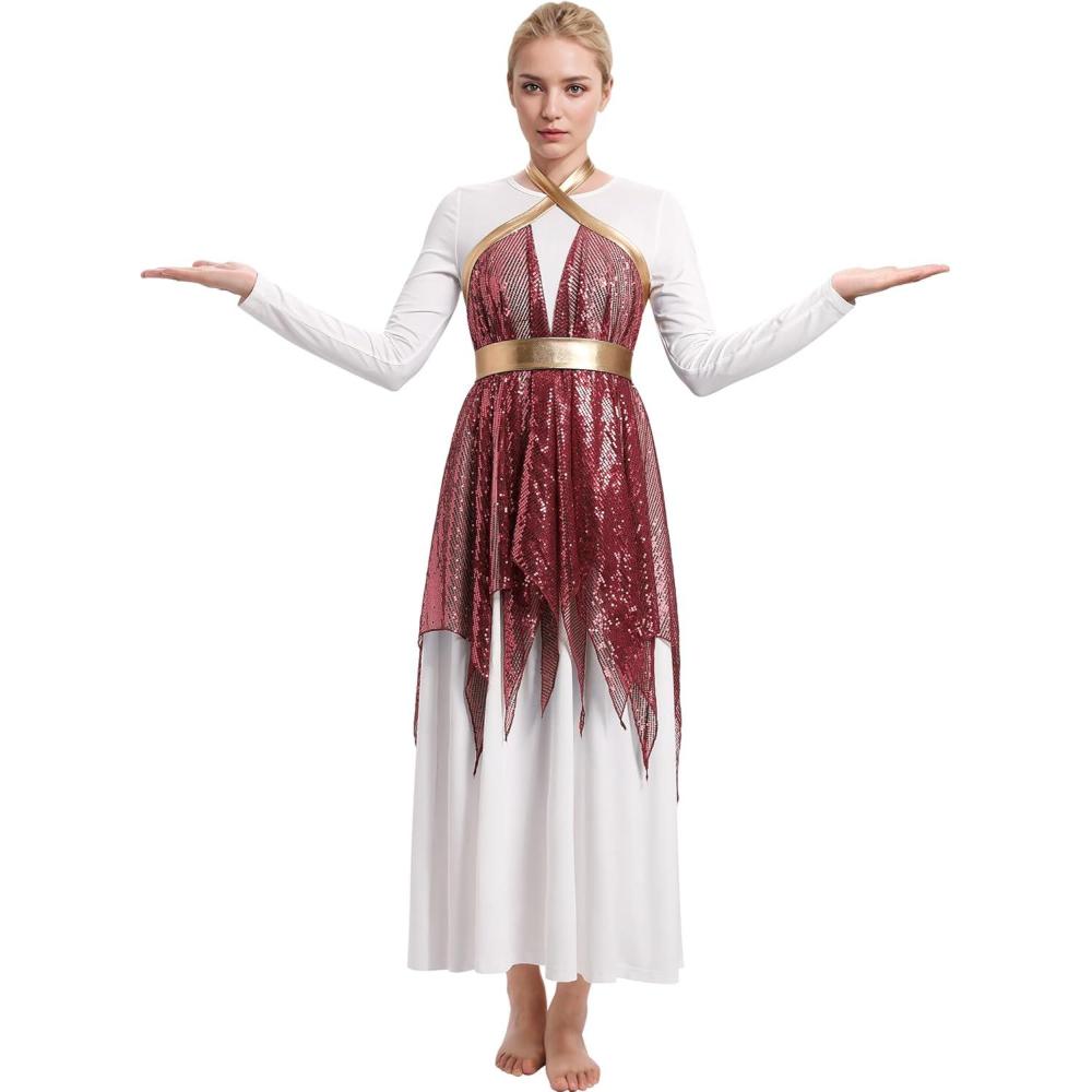 Features: Long Sleeve, Round Neck, Metallic, Sequins, Color Block, Snap Closure, Removable Belt, Ruffle, Handkerchief Hem