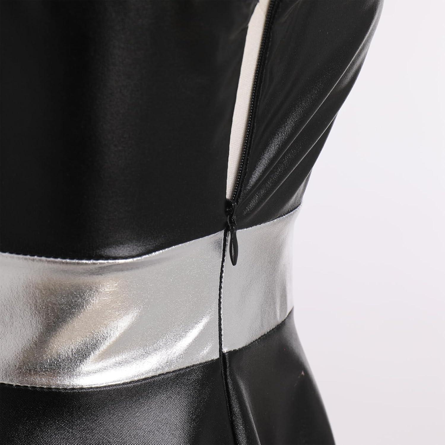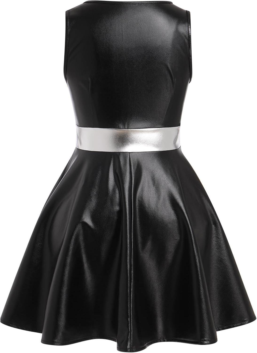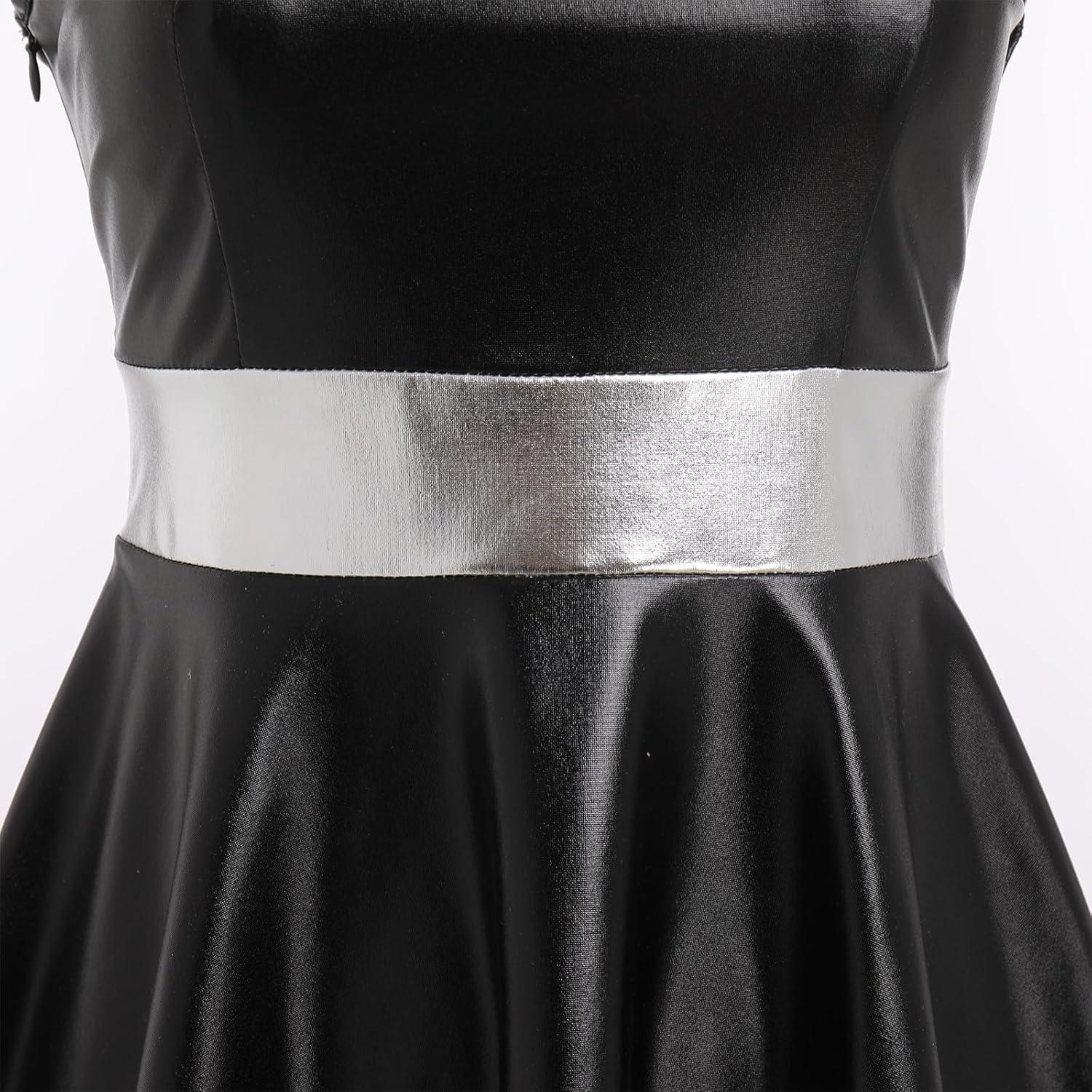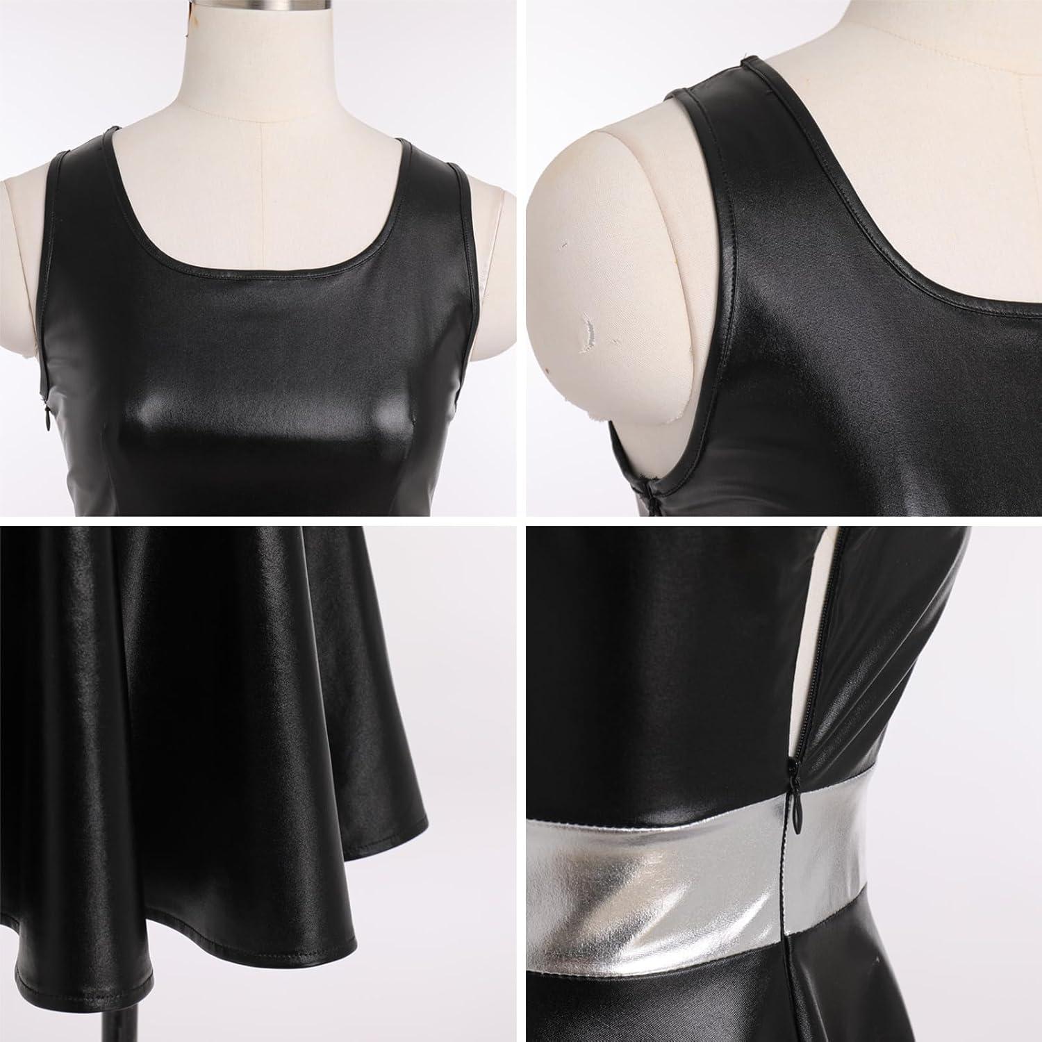IDOPIP Women’s Shiny Metallic Dress Sexy Sleeveless Skater Mini Dress Holographic Party Rave Dance Clubwear Halloween Costume(Black)