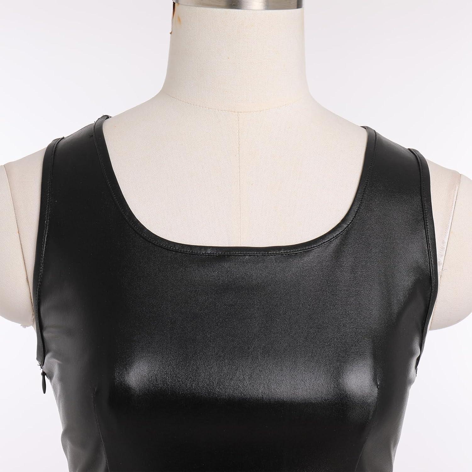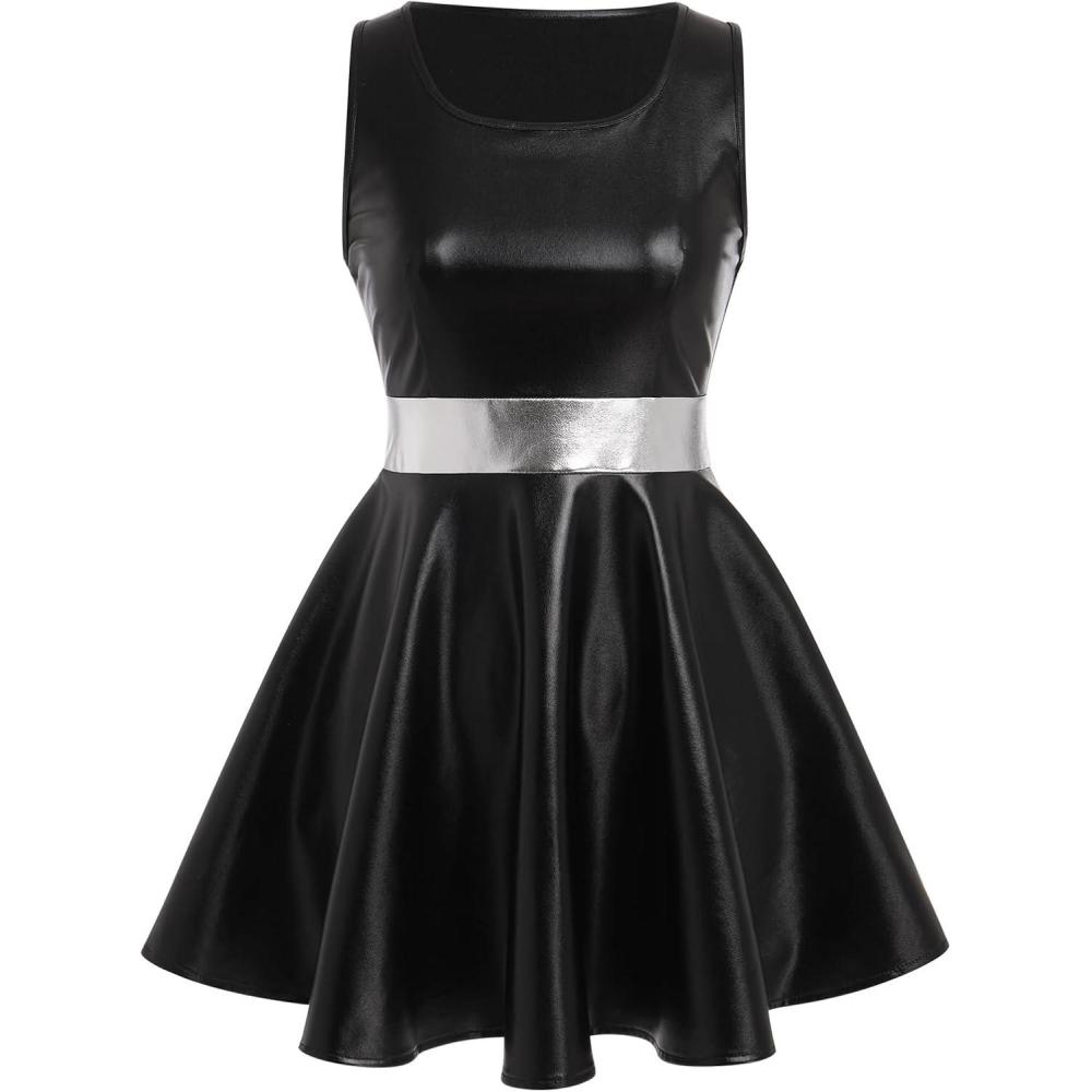 imageIDOPIP Womens Shiny Metallic Dress Sexy Sleeveless Skater Mini Dress Holographic Party Rave Dance Clubwear Halloween CostumeBlack