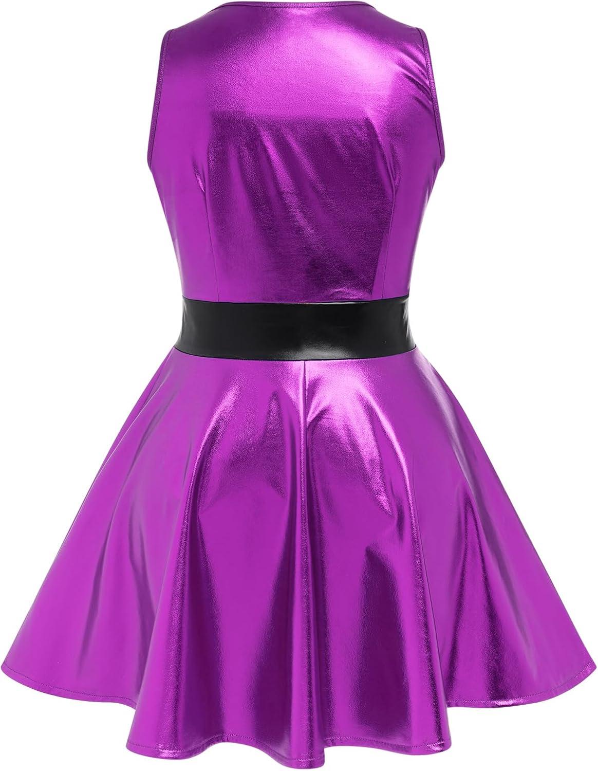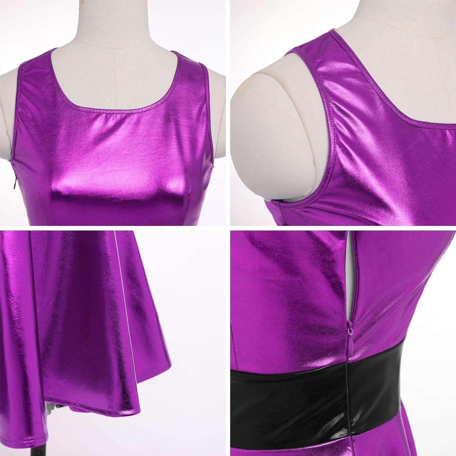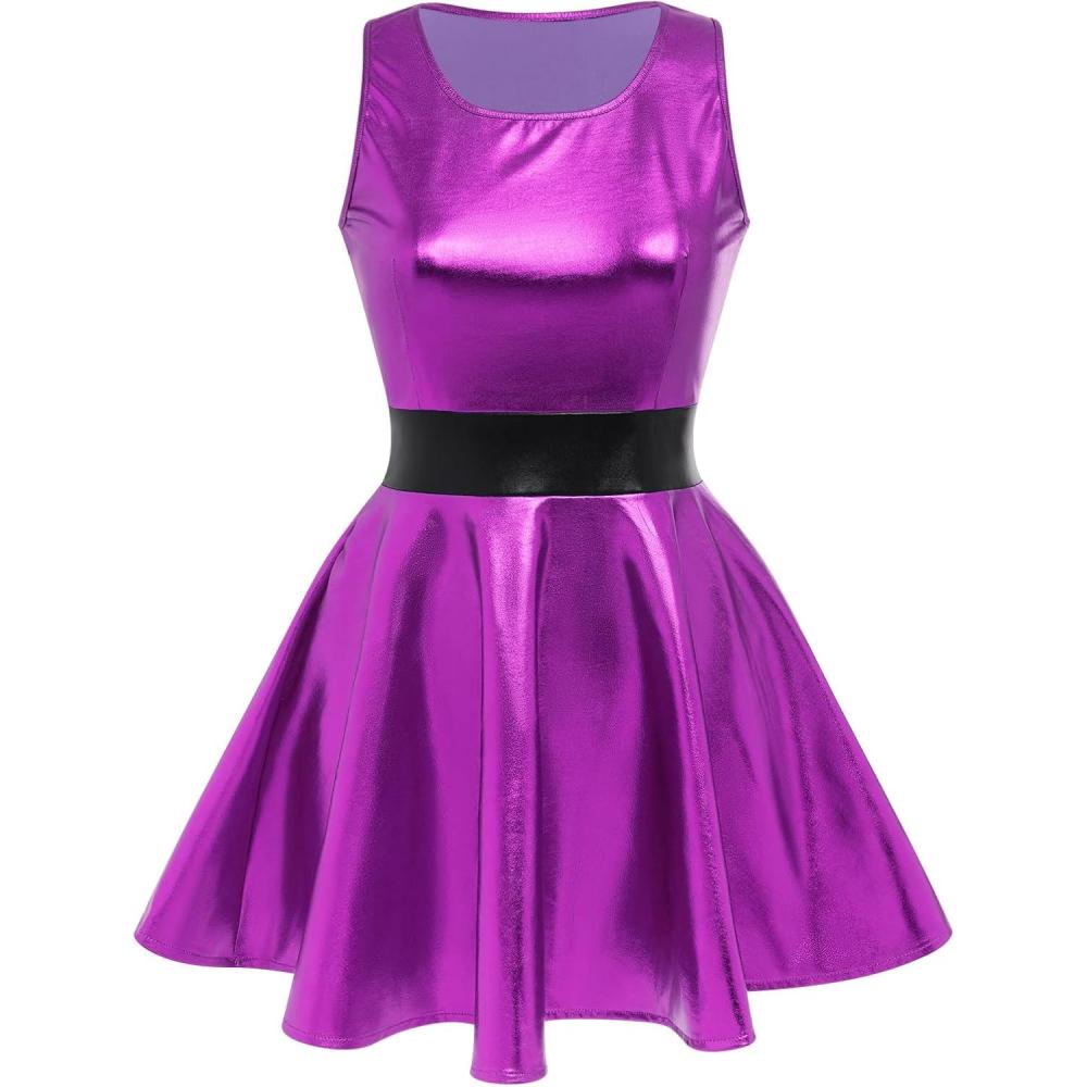 IDOPIP Women’s Shiny Metallic Dress Sexy Sleeveless Skater Mini Dress Holographic Party Rave Dance Clubwear Halloween Costume(Purple)