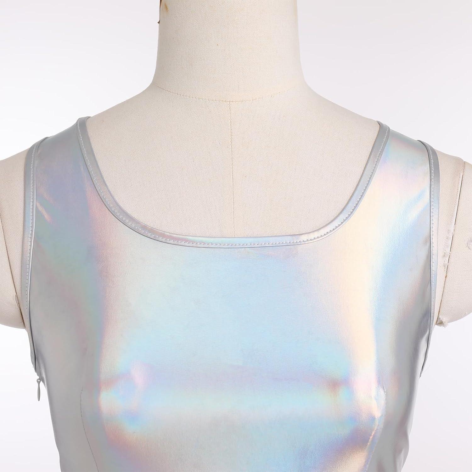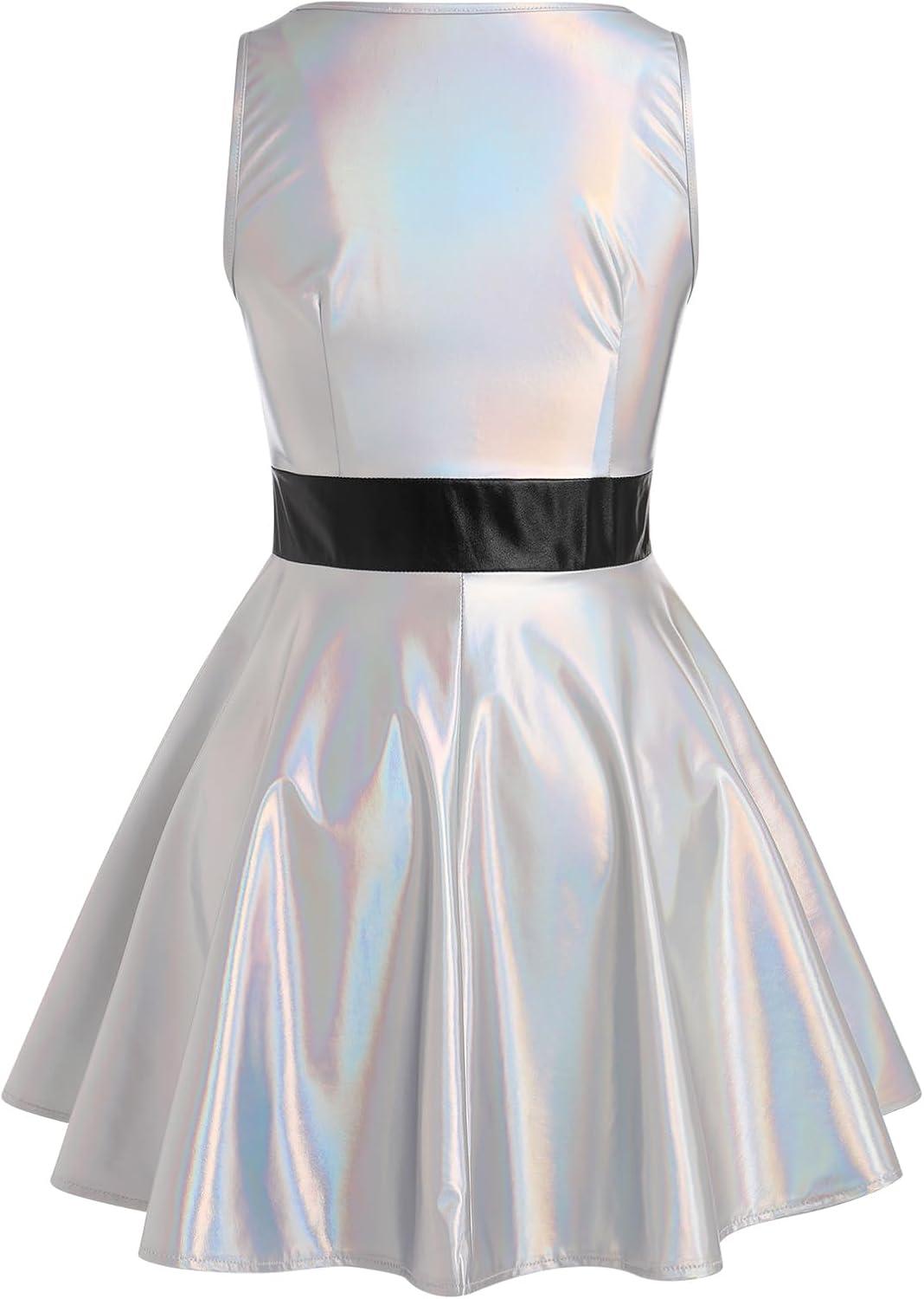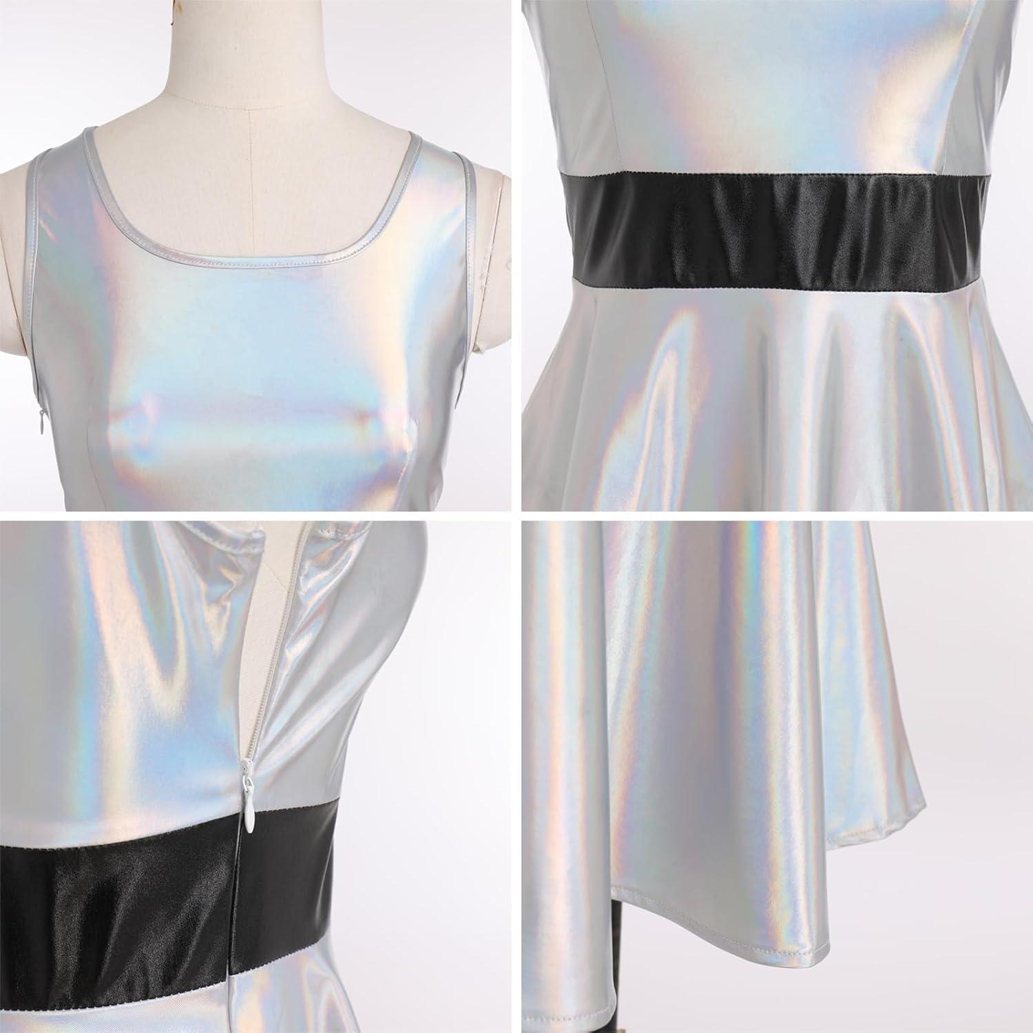 IDOPIP Women’s Shiny Metallic Dress Sexy Sleeveless Skater Mini Dress Holographic Party Rave Dance Clubwear Halloween Costume(Silver)
